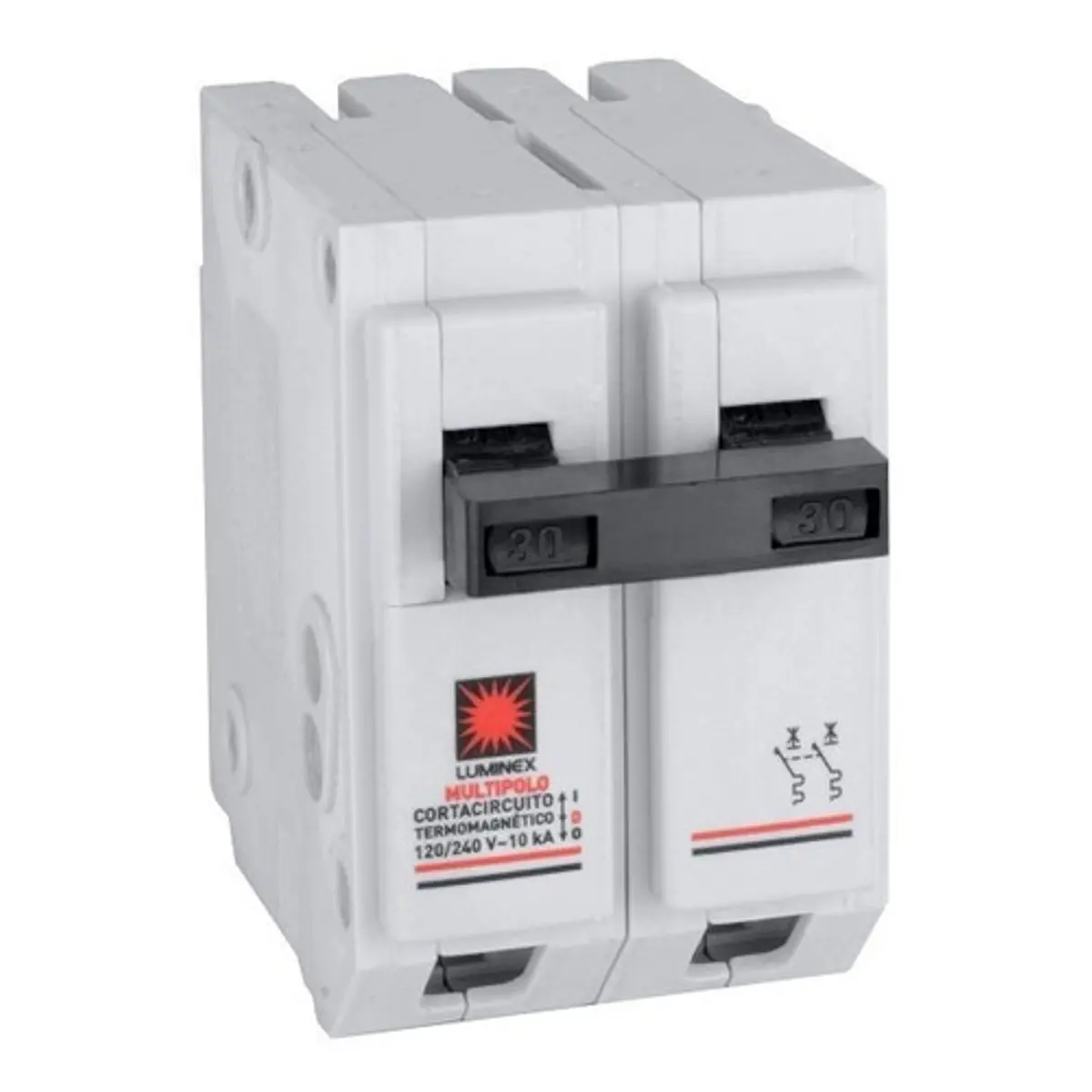 Breaker bipolar enchufable Luminex de 2×30 amperios, ideal para proteger circuitos eléctricos con seguridad y eficiencia.