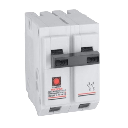 Breaker bipolar enchufable Luminex de 2×50 amperios, ideal para proteger circuitos eléctricos con seguridad y eficiencia.